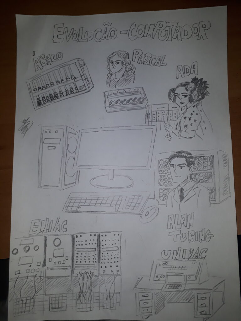 O desenho trás a evolução da computação, que começou pelo ábaco, instrumento chinês criado no Século V a.c, instrumento feito para calcular